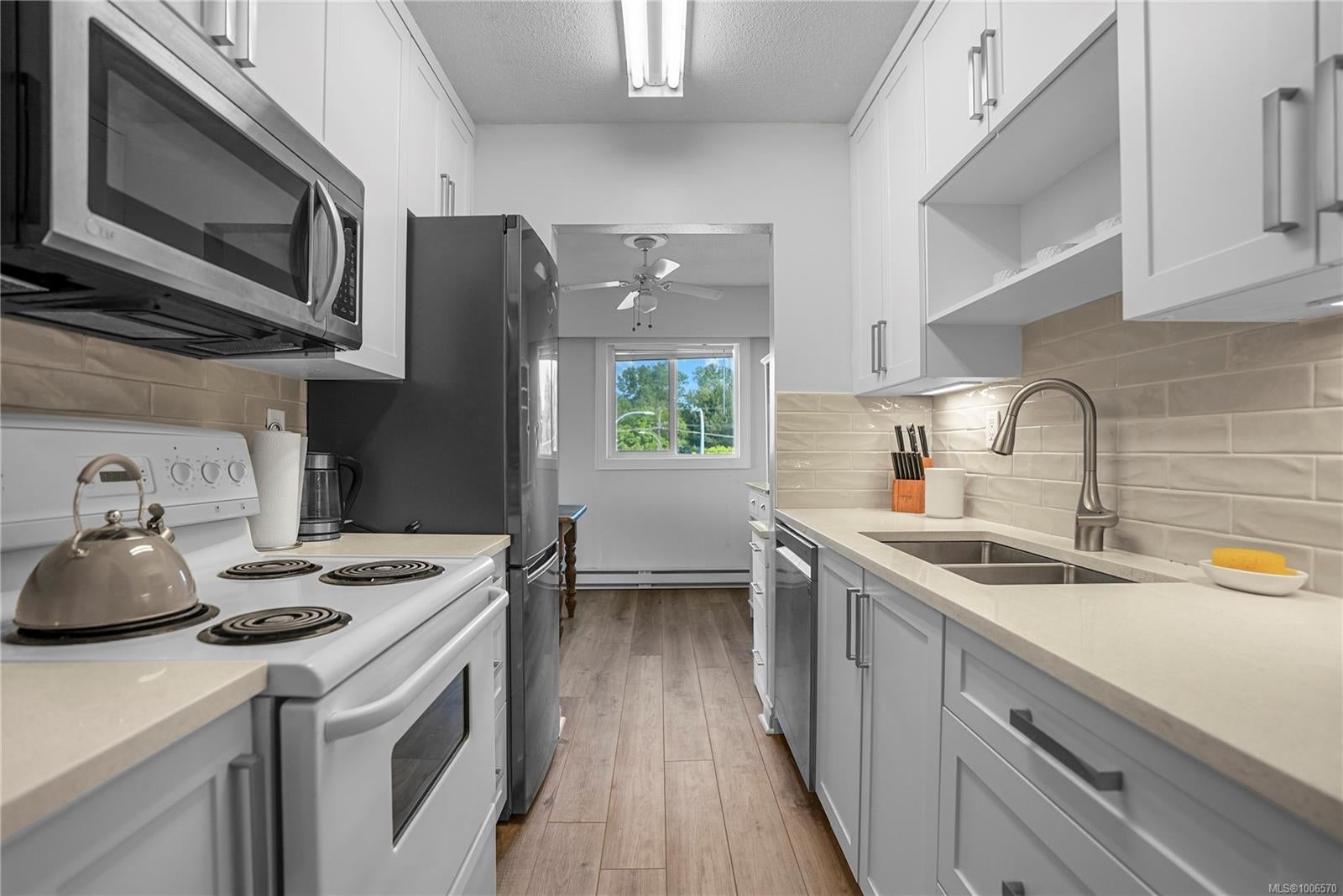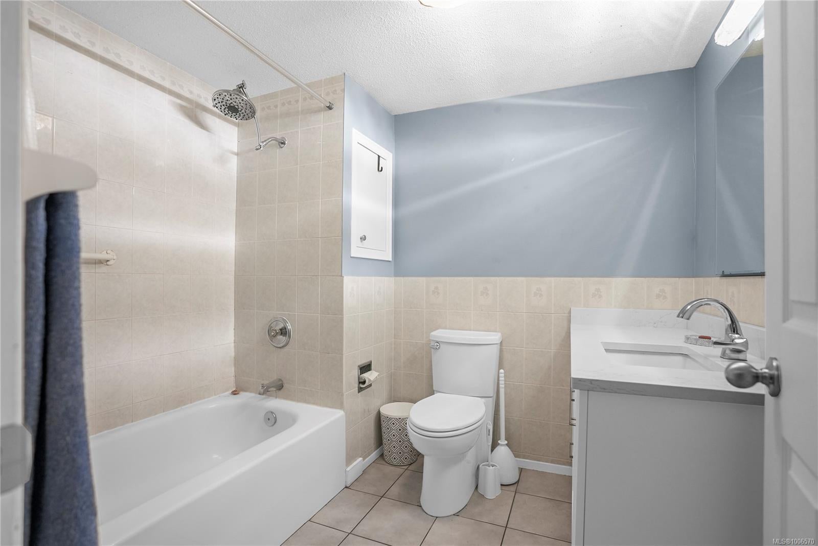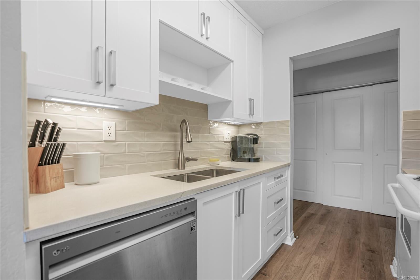 Welcome to University Park Terrace, ideally located just one block from the entrance to UVIC. Rarely available, this bright & spacious top-floor corner unit offers 2 beds, 1 bath, window in dining area, & 1,097 s/f of living space. Enjoy a newly upgraded and modern kitchen & bathrooms, & brand-new laminate flooring, adding style & durability. The large, light-filled living room opens onto a generous 106 s/f balcony, perfectly positioned to capture the morning sun—ideal for your morning coffee or quiet study time. Both bedrooms are generously sized with plenty of natural light & direct access to the balcony. Additional features include in-suite laundry, dedicated parking, & a separate storage locker. The building also offers common bike storage! Located just minutes from Tuscany Village, shops, restaurants, parks, & transit, this is an unbeatable location whether you're looking for a home or a smart investment property—perfect for UVic students. Vacant & ready for immediate possession.