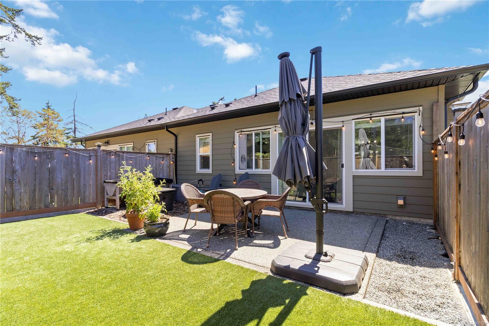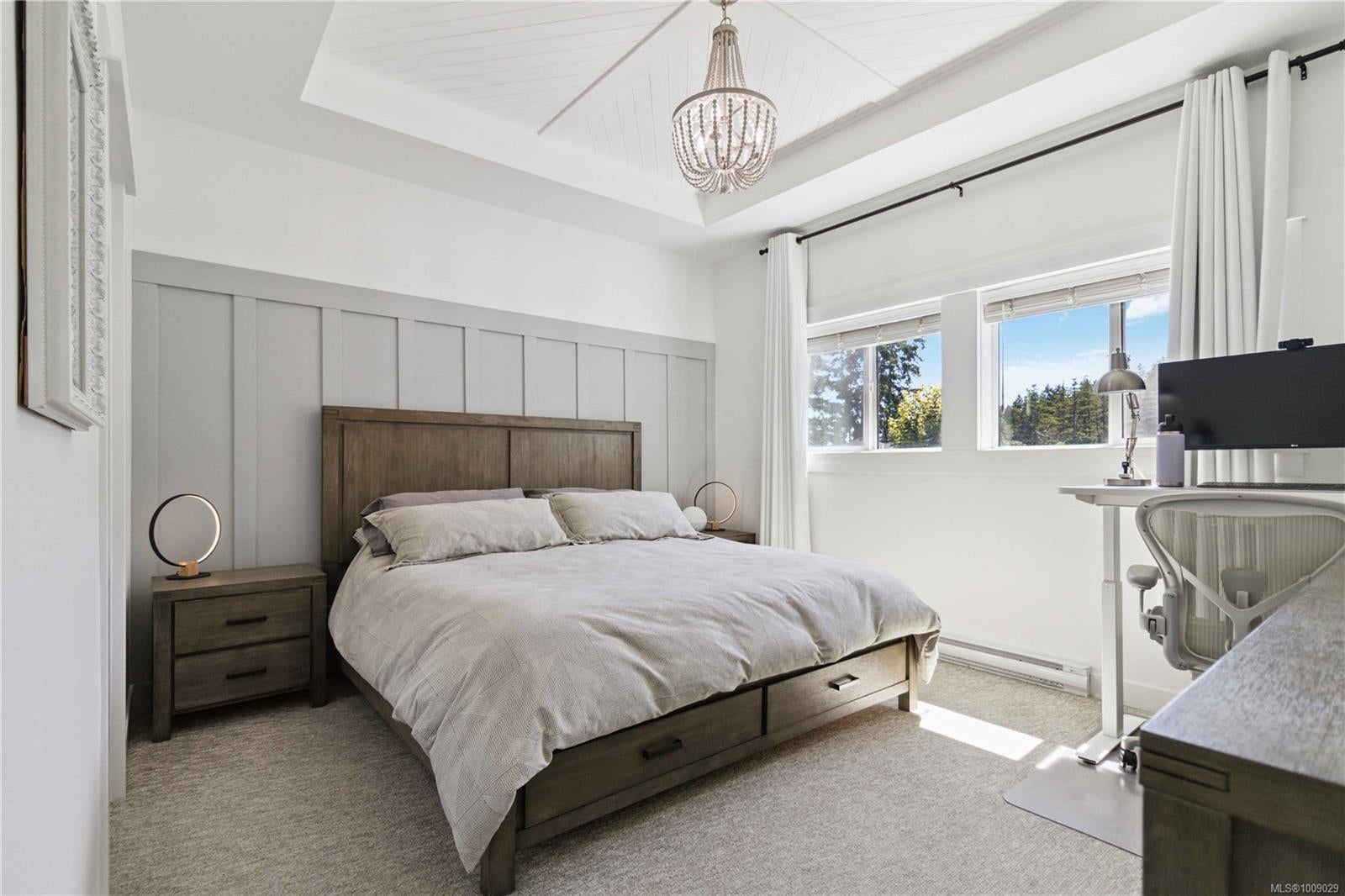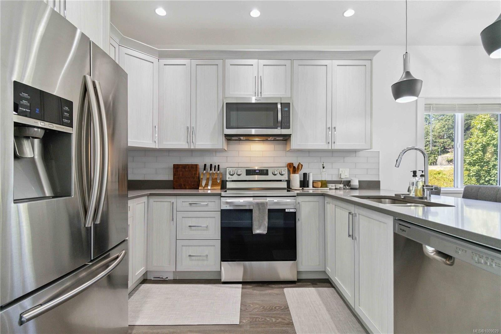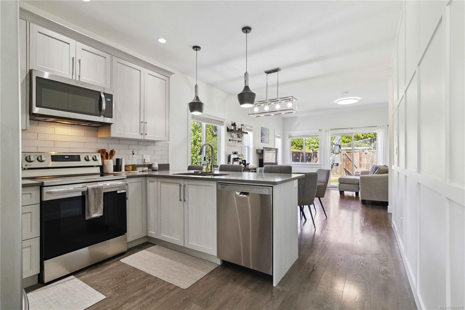Stylish & spacious townhome just steps from Thetis Lake. This immaculate 2018-built duplex-style townhome offers a blend of modern design, comfort, and location. Inside, you'll be welcomed by custom touches like wainscoting and shiplap details throughout. The thoughtfully designed floor plan places the oversized primary bedroom on the main (upper) level, complete with a coffered ceiling, a large walk-in closet, and a beautiful ensuite. Enjoy indoor-outdoor living with a low-maintenance backyard featuring synthetic turf and a natural gas BBQ quick-connect, just off the main living area. The lower level offers flexibility with a spacious recreation room, two bedrooms, a full bathroom, and a dedicated home gym space. Includes energy-efficient features such as a direct-vent Rinnai natural gas furnace, on-demand hot water, & a cozy gas fireplace. Low strata fees & remaining home warranty! This home truly checks all the boxes in a prime location near nature.
