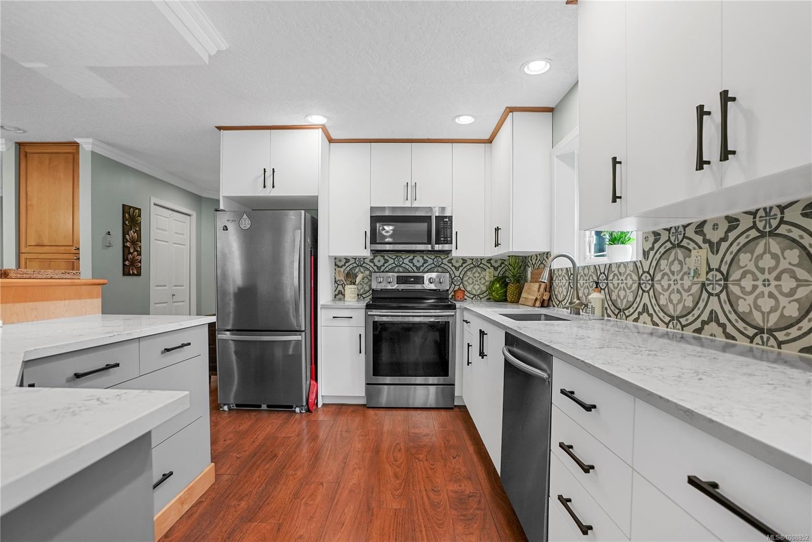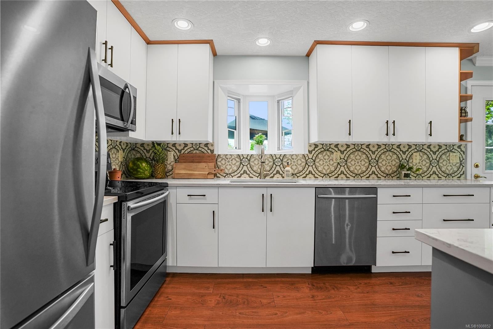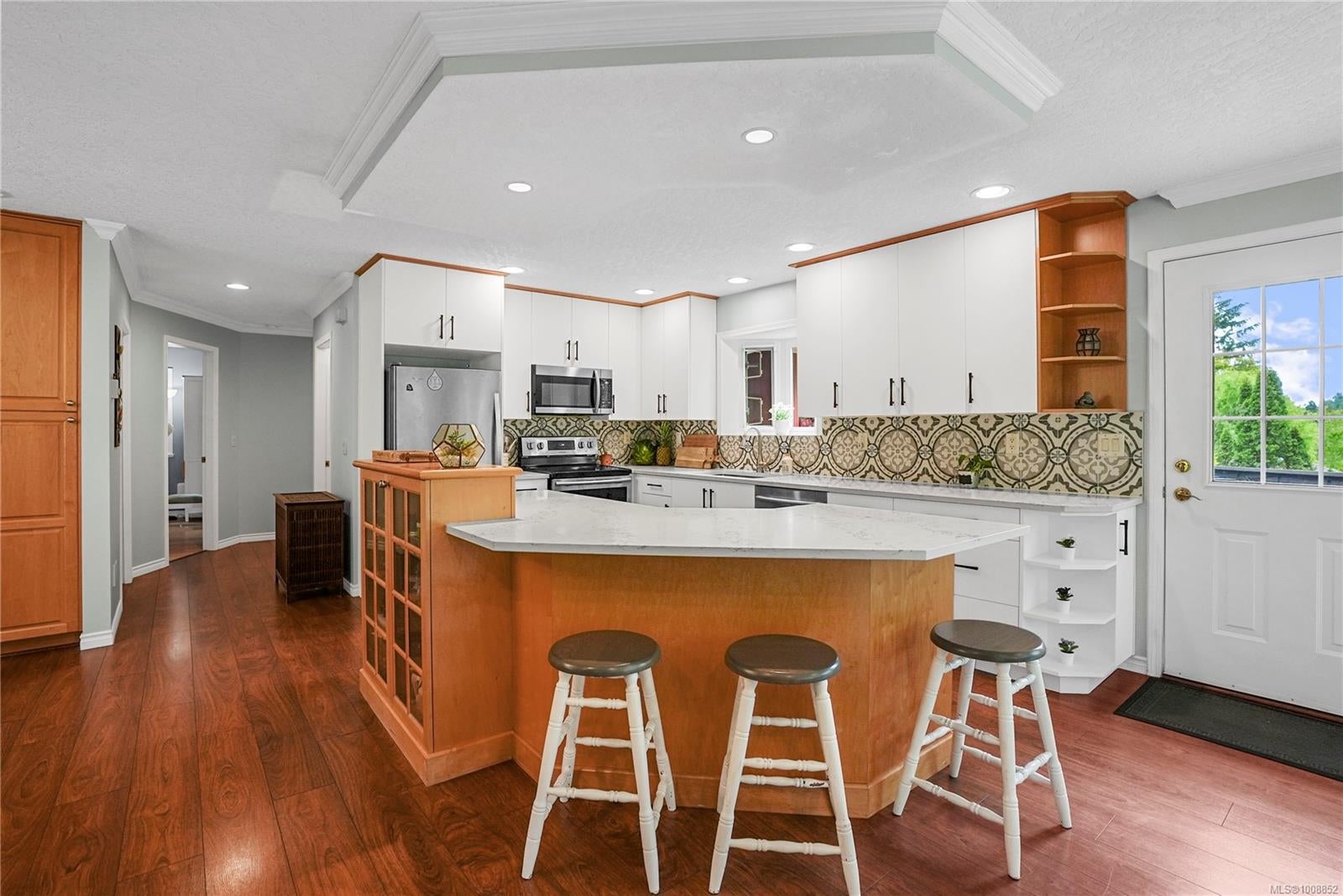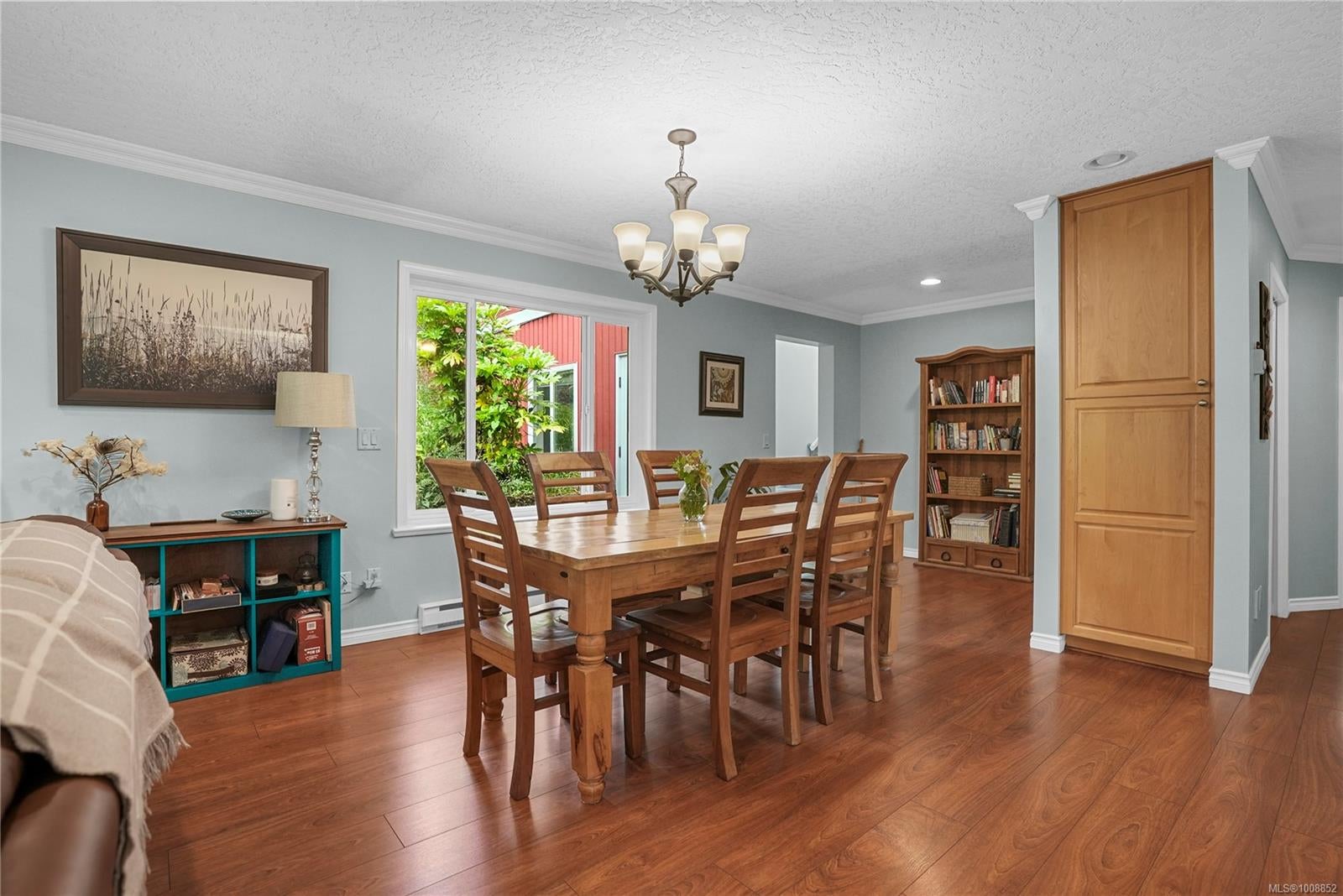 A rare gem! This Arts & Crafts-style farm-home sits on a large, stunning, private lot that backs directly onto a neighborhood park. Expansive wrap-around decks to enjoy and bright windows flood the interior space with natural light. The open-concept main level features dining and living rm complete w/cozy wood/fireplace and a custom kitchen with a large island and eating bar—perfect for entertaining. The coveted main floor primary bedroom offers a walk-in closet, and 4-piece ensuite, and 2 additional bedrms. Upstairs, includes 3rd and 4th bedrooms, great for a family or guest/hobby rm. Updated in 2001 & newer windows and recent new carpet. Handy single garage/workshop area and exterior shed! Enjoy a large deck for outdoor living & a lovely backyard to grow and play. All nestled on a quiet cul-de-sac situated in the Brentwood Bay community! A warm, inviting home in a magical setting—this one is a must-see!
