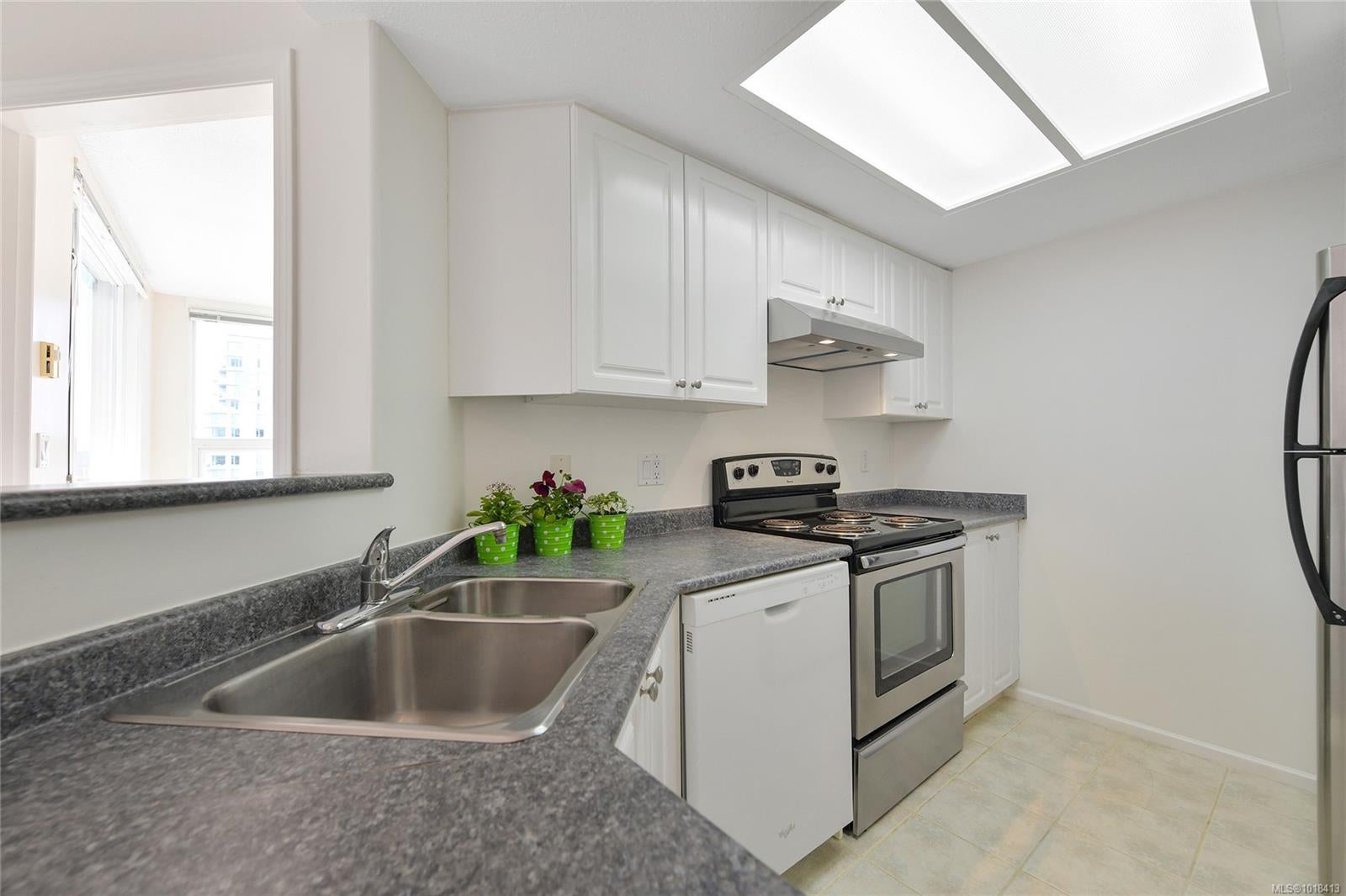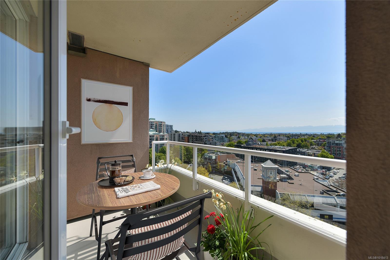 Enjoy the BEST PRICED 2 bedroom condo in an urban living at its finest in this downtown unit perched on the 12th floor of a solid steel and concrete building. Soak in sweeping views of the city, Sooke Hills, water, and mountains from your private patio — the perfect spot for morning coffee or evening BBQs. Inside, the thoughtful layout includes in-suite laundry and a flexible second bedroom/den. The building offers great amenities including a gym and guest suite, and rentals are welcome, making this home ideal for both owners and investors. PRICED TO SELL!!